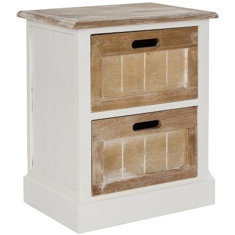 Biała szafka prowansalska z dwiema szufladami o bardzo oryginalnych frontach przypominających drewniane kosze.