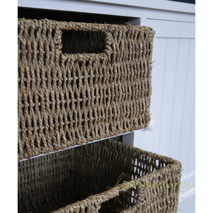 Niska komoda prowansalska została wykonana z drewna i ma zamykaną szafkę oraz dwa pojemne kosze wiklinowe.