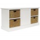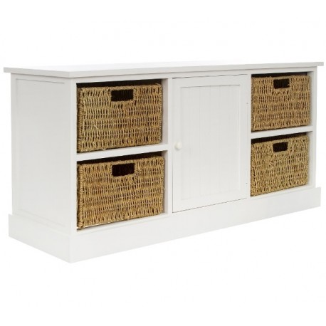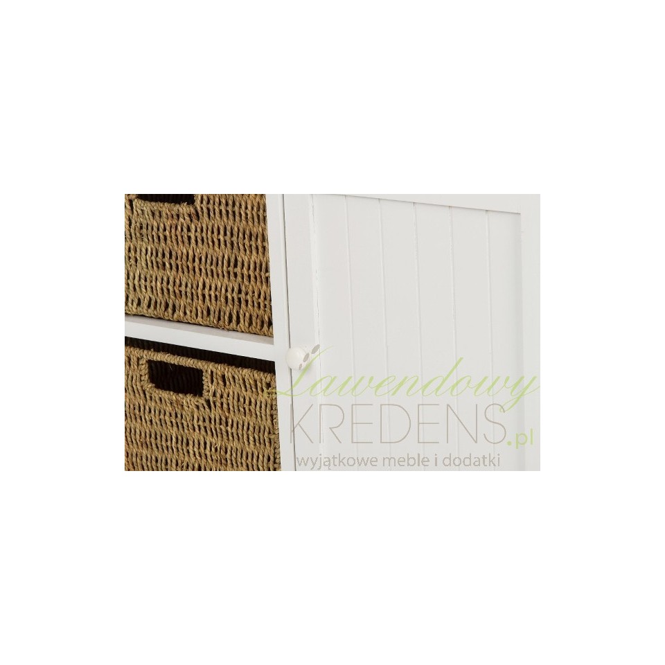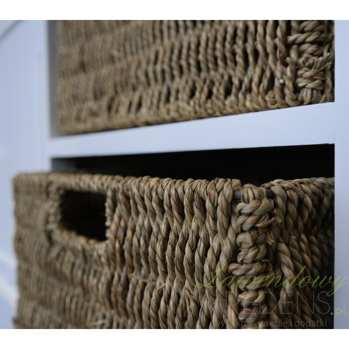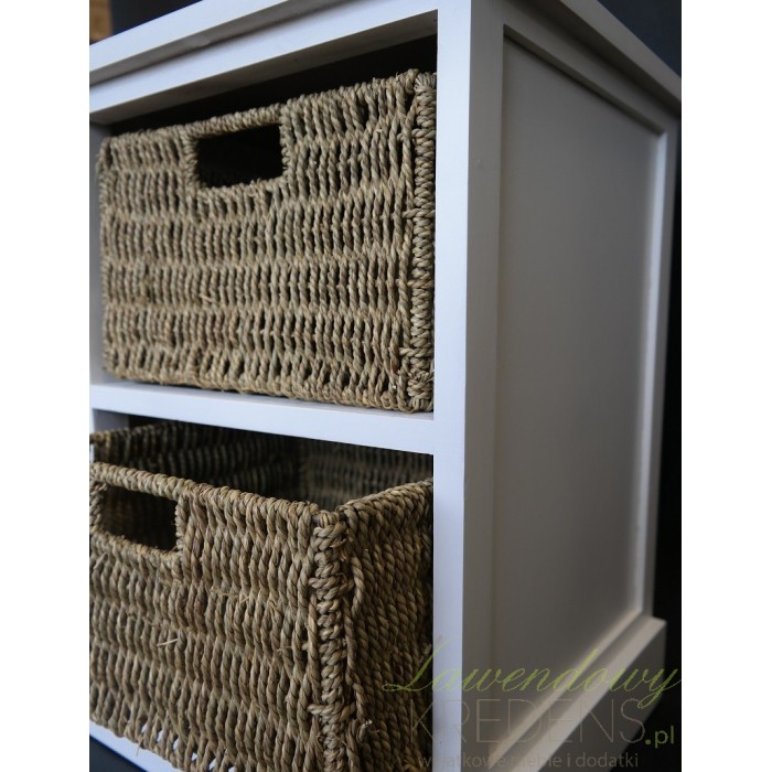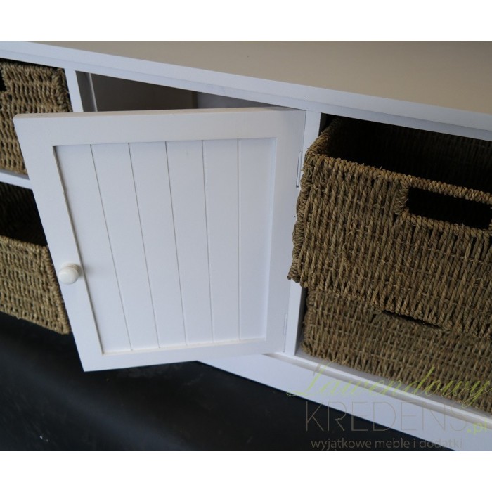 Genialna i praktyczna komoda w koszami, któe znajdują się po dwóch stronach zamykanej drzwiczkami szafki. Jej niewielka wysokość i piękny wygląd sprawiają, że ta komoda świetnie sprawdzi się tak w przedpokoju, sypialni czy jako komoda pod telewizor i niezbędne akcesoria.