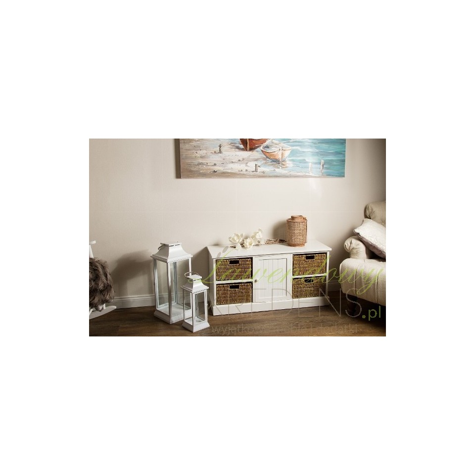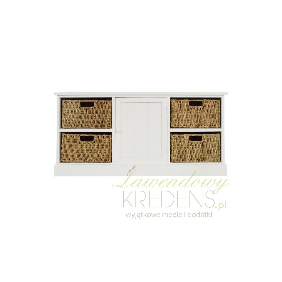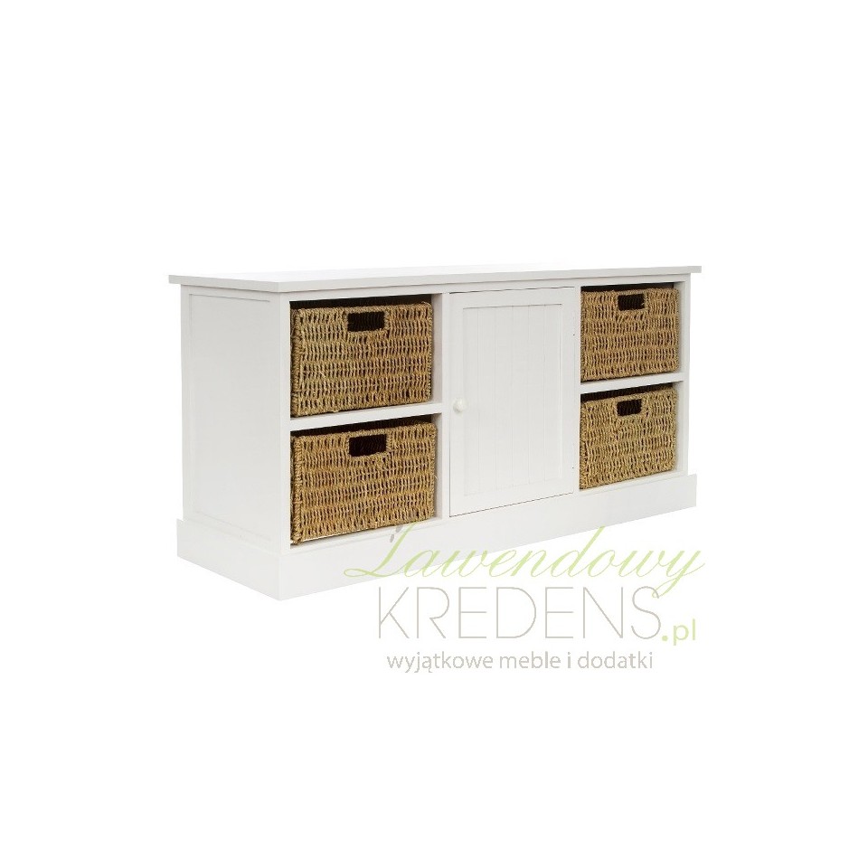 Niska komoda o białej powierzchni z zamykaną szafką i czterema dużymi koszami! Niesamowity efekt wizualny!