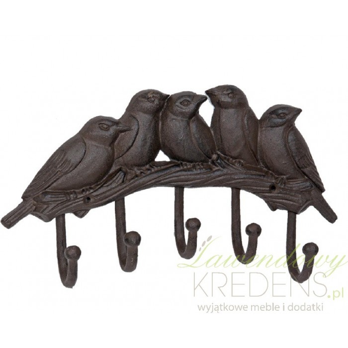 Żeliwny wieszak ścienny, udekorowany ptasimi figurkami, które wyglądają jakby siedziały na prawdziwej gałęzi! Aż pięc haczyków!