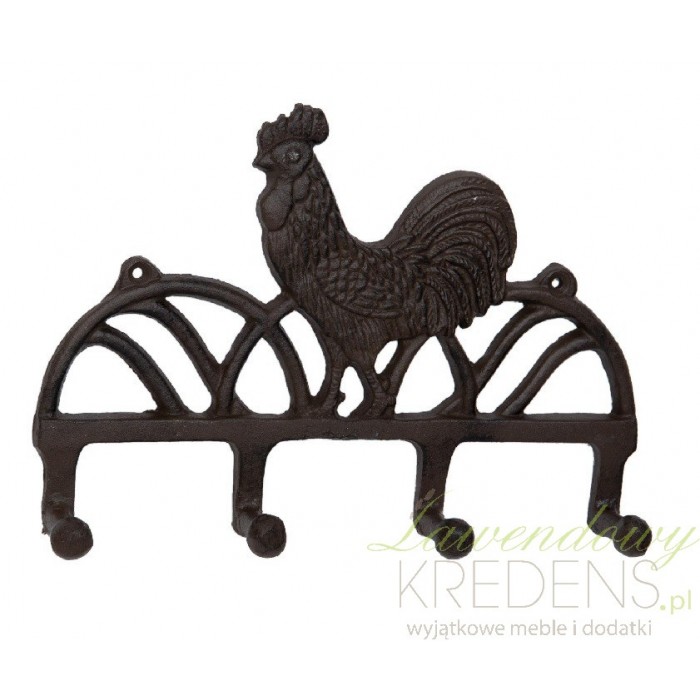 Wieszak żeliwny z kogutem to wyjątkowy dodatek do Twojej kuchni. Wykonany z żeliwa w brązowym kolorze został wyposażony w cztery uchwyty i ozdobiony rzeźbionym kogutem. Wieszak posiada dwa małe otwory w górnej części dzięki którym zamontujesz go w dowolnym miejscu w swoim domu. Wieszak idealnie sprawdzi się w kuchni, gdzie będziesz mógł odwiesić ręcznik kuchenny, fartuszek czy też rękawice kuchenną.