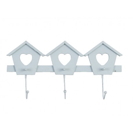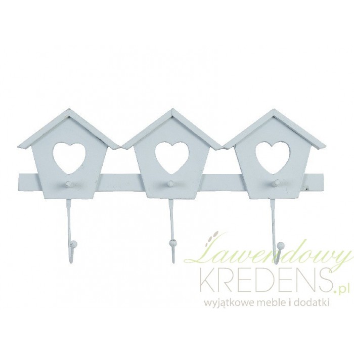 Wieszak prowansalski o uroczym błękitnym kolorze, wykonany został z drewna oraz metalu. Wieszaki ścienne o kształcie trzech domków, które posiadają otwory w kształcie serc to piękna dekoracja na przykład do dziecięcego pokoju. Wieszaki w stylu prowansalskim to niezwykle wyjątkowa oferta z której można wybrać odpowiedni przedmiot do swoich czterech kątów.