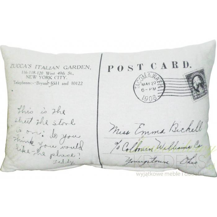 Poduszka francuska jest podłużna i ma na sobie wzór pocztówki. Na poduszce widać takie elementy jak znaczek, pieczątkę i charakterystyczną dla pocztówki linię przedzielającą adres od treści wiadomości. Poduszki w stylu francuskim to poduszki ozdobne, które pięknie wyglądają na łóżku. Jeśli szukasz niestandardowych poduszek to polecamy właśnie tą z naszej oferty!