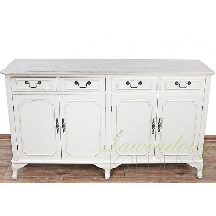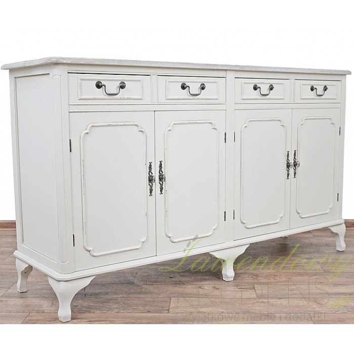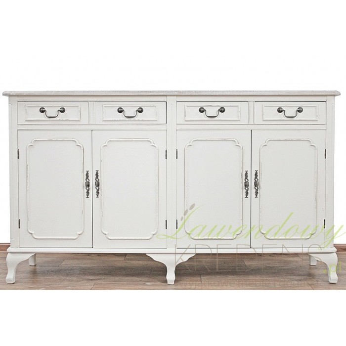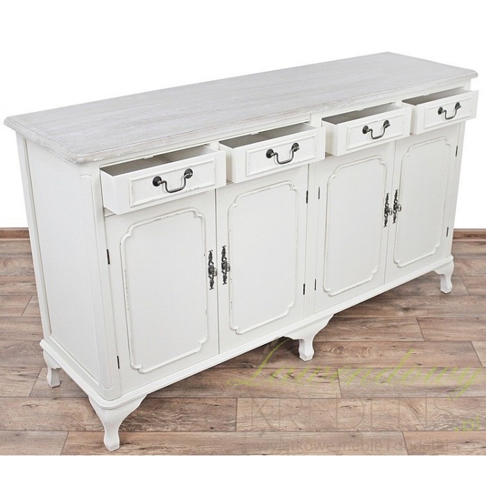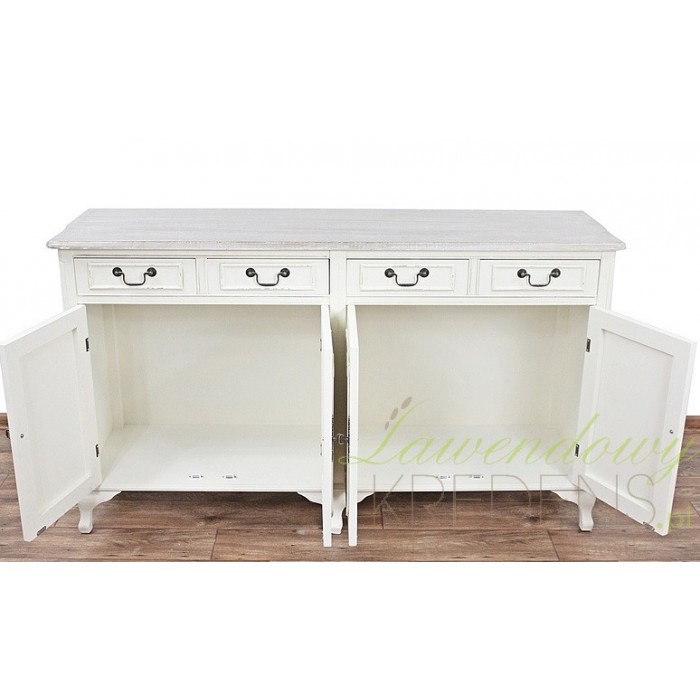 Meble prowansalskie z kolekcji Colli są wykonane z dbałością o każdy szczegół i świetnie pasują do wielu aranżacji. Szeroka komoda prowansalska to przykład mebla odpowiedniego do dużego salonu lub do jadalni. Komoda w stylu prowansalskim ma dwie duże szafki i cztery szufladki, które wyposażono w prostokątne uchwyty z metalu. Mebel stoi stabilnie na sześciu nogach, a jego wnętrze to przestrzeń, którą wykorzystasz na tekstylia lub naczynia.