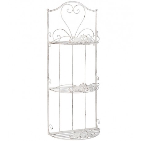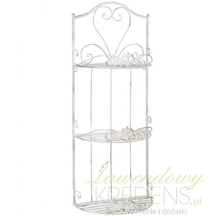 Wykonana z precyzją, ozdobna, metalowa półka, posiadająca trzy półkoliste poziomy. Każda półka posiada dekoracyjny rant, który zawiera motyw roślinny, natomiast na całością góruje utworzone z prętów serce. Prezentowana półka ścienna może być także oryginalnym kwietnikiem tak do wnętrza jak i na taras!