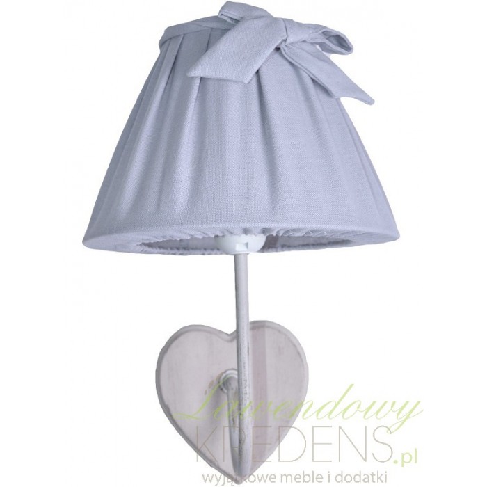Oświetlenie prowansalskie i kinkiety w stylu prowansalskim w niepowtarzalny sposób ocieplą wnętrze twojego domu. Kinkiet prowansalski wykonany jest z wysokiej jakości drewna i metalu. Kinkiet ma beżowy kolor a abażur stanowiący jego przepiękną dekorację kolor szary i wykonany jest z bawełny. Kinkiet poprzez cudowne serduszko wspaniale ozdobi wnętrze domu i sprawi, że każdy będzie się czuł jak u siebie.