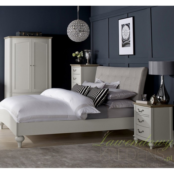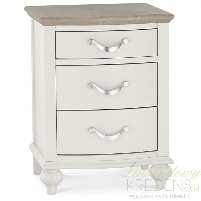 Szafka nocna w stylu prowansalskim z trzema szufladami posiadającymi system cichego domyku. Jasnoszary kolor połączony z brązowym batem, który wykonany jest z drewna dębowego świetnie wkomponują się w każde pomieszczenie. Poręczne uchwty szufladek są koloru srebrnego zaś przednie nóżki posiadają pękaty kształt.