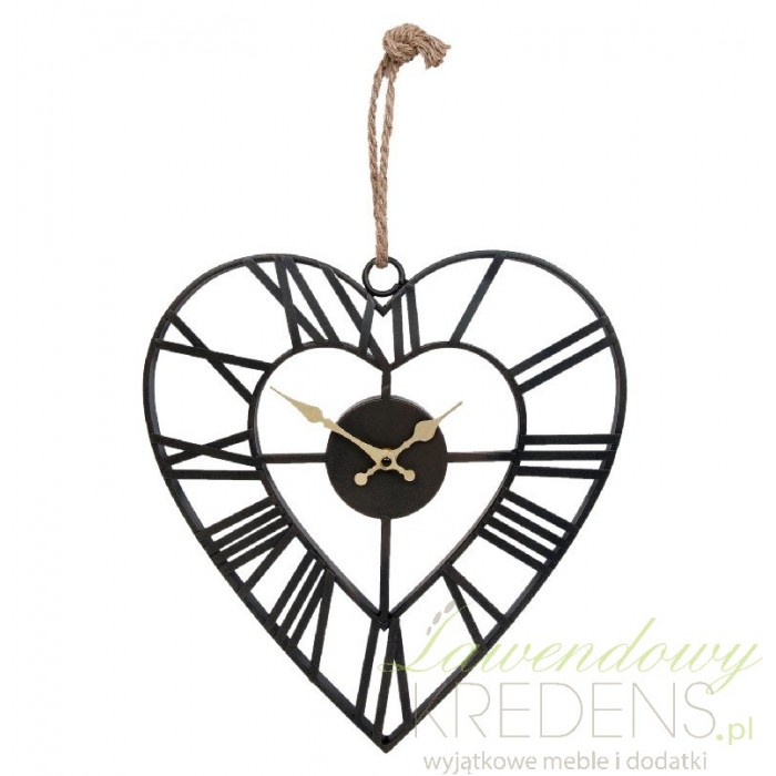 Zegar metalowy w brązowym kolorze, jego kształt przypomina serce, które umieszczone zostało na parcianym sznurku. Zegar serce to nietuzinkowa tarcza z rzymskimi cyframi na które wskazują jasne kontrastujące wskazówki. Zegary ścienne to praktyczne dodatki, które odmierzą czas w niezwykle przyjemny sposób.