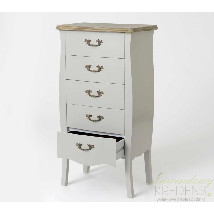 Meble w stylu prowansalskim charakteryzują się przepiękną finezyjną linią i licznymi zdobieniami. Tak też wygląda cudowna komoda prowansalska osadzona na czterech delikatnie wygiętych nóżkach. Szara komoda z kolekcji Diana ma pięć szufladek na bieliznę i ubrania. Uchwyty do komody wyróżniają się wspaniałymi rzeźbieniami, a jej blat ma kolor brązowy.