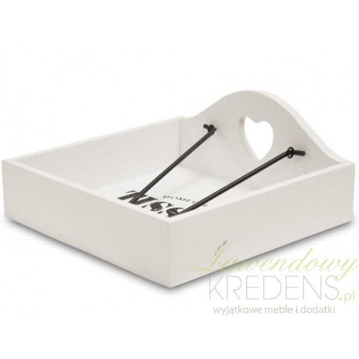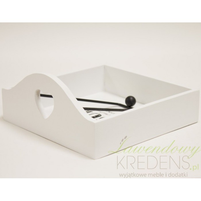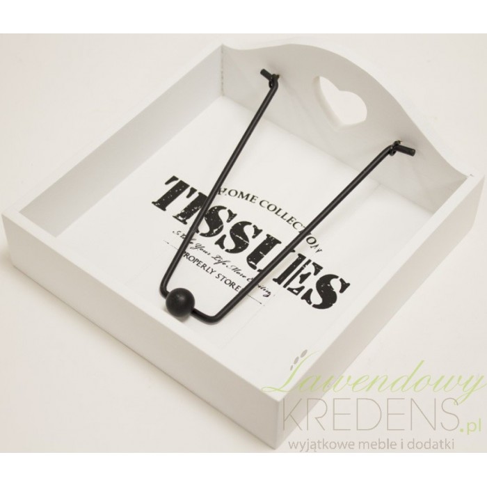 Biały serwetnik prowansalski jest niezastąpiony w kuchni i w jadalni. Jedna z bocznych krawędzi pojemnika, do której są przymocowane metalowe obciążniki do serwetek ma wycięcie w kształcie serca. Na dnie serwetnika znajduje się odciśnięty niczym pieczęć - napis Tissues. Dodatki w stylu prowansalskim nie zawiodą Cię i dodą wnętrzu uroku.