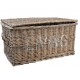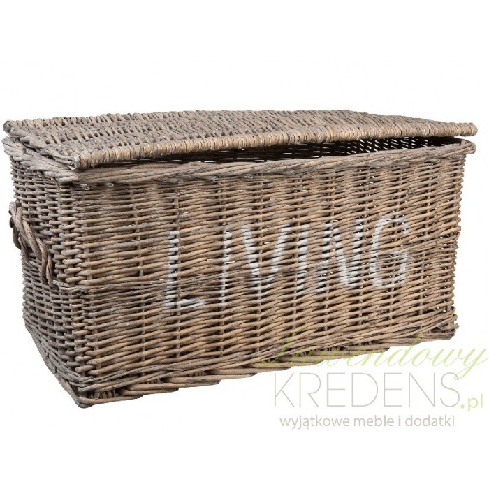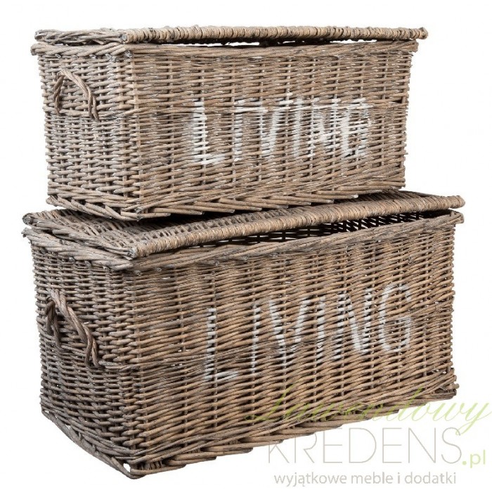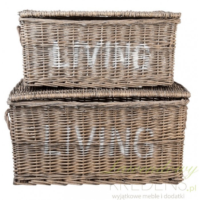 Duże kosze wiklinowe w brązowym kolorze mają funkcjonalne uchwyty po bokach oraz przykrywki. Na każdym z nich znajduje się biały napis LIVING. Kosze rattanowe możesz wykorzystać jako kosz na pranie, pojemniki na bieliznę bądź inne tekstylia. Stylowe kosze będą pasowały do wnętrz skandynawskich, francuskich ale równie dobrze spełnią swoje funkcje w nowoczesnej przestrzeni.