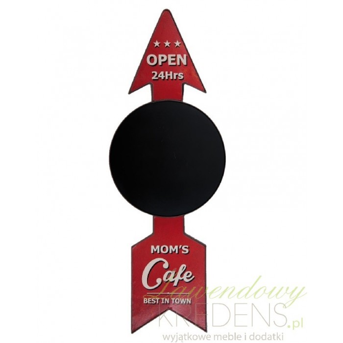 Oryginalna tablica do pisania o okrągłym kształcie, zamieszczona została na środku czerwonej strzałki. Tablica w stylu retro wykonana została z metalu na którym znajdują się także napisy. Dodatki w stylu retro nadadzą wnętrzu interesujący klimat.