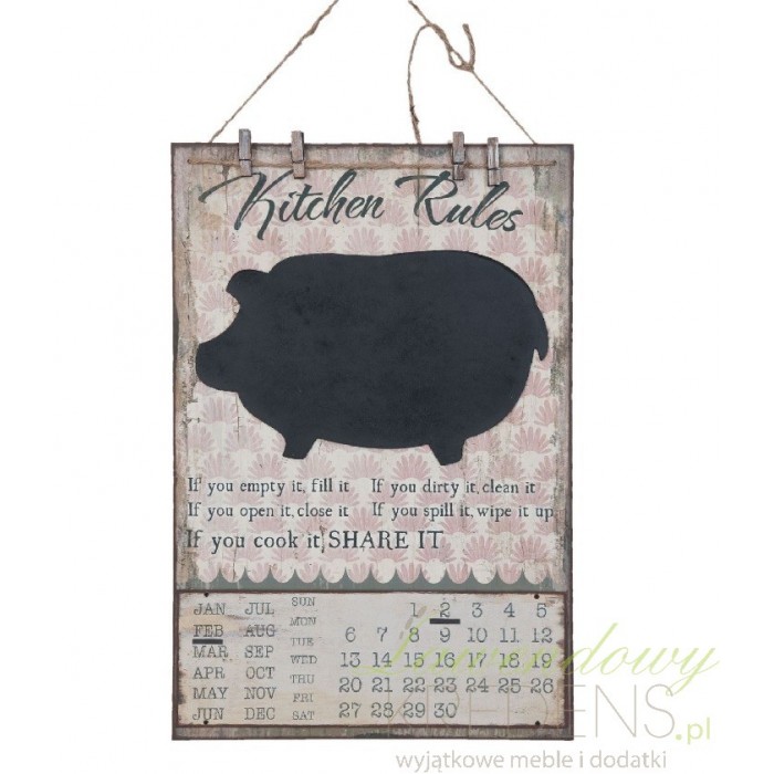 Drewniana zawieszka to wielofunkcyjna dekoracja, ponieważ oprócz tego, że oryginalnie zdobi ścianę ma również kalendarz i tabliczkę do pisania w kształcie świnki. Obtarte krawędzie i postarzane tło wraz z angielskimi napisami i różową grafiką tworzą ozdobę, która nigdy się nie znudzi. W górnej części tabliczki są przypięte cztery drewniane spinacze. Nie zwlekaj i dodaj swojej kuchni oryginalności już teraz!