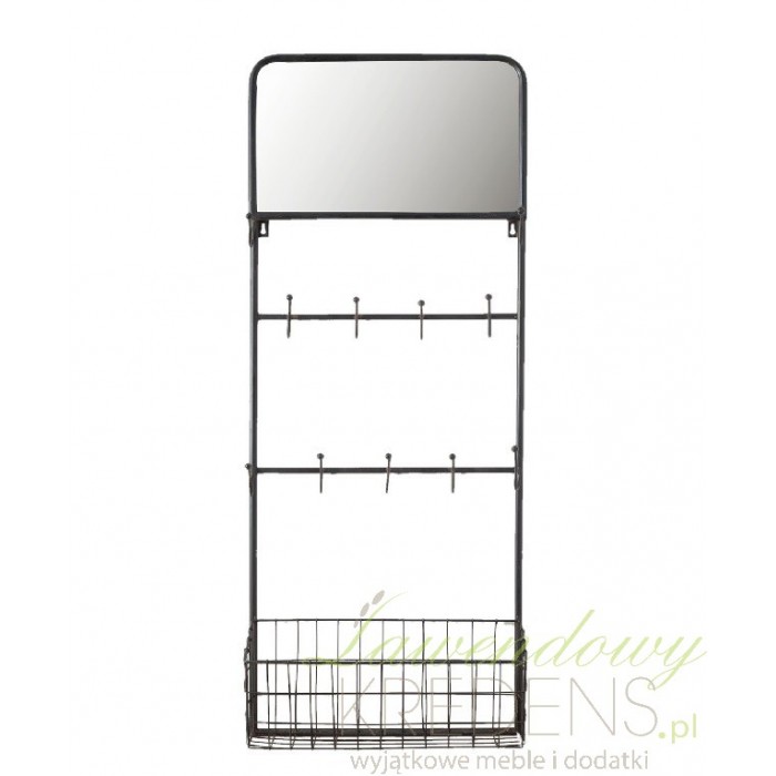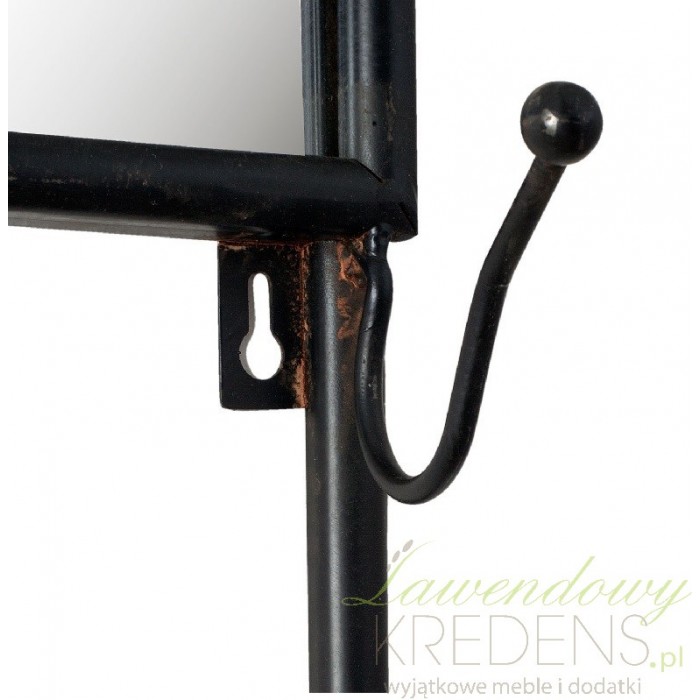 Wieszaczki ścienne i lustro oraz kosz są zamontowane do prostokątnego stelaża. Na samym dole zamontowano lustro, pośrodku na dwóch drążkach haczyki, a na samej górze lustro. Czarny mebel o tak wielu funkcjach to świetna okazja! Metalowe meble z postarzeniami są niezawodne jeżeli oczekujesz praktyczności.
