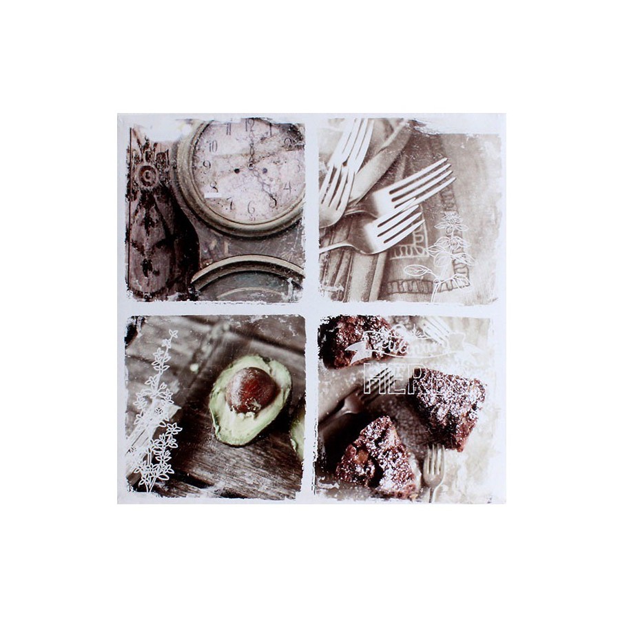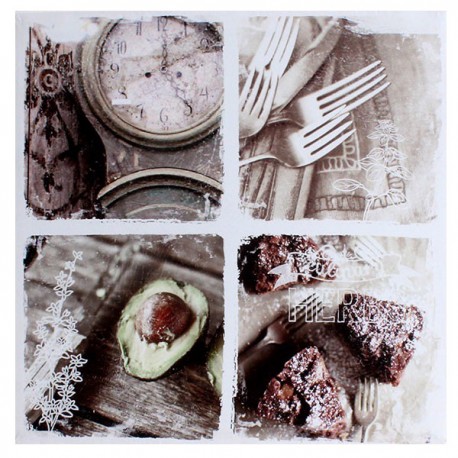 Obraz do kuchni to jeden z obrazów idealnie pasujących do wystroju restauracji, z racji na cudowną kolorystykę oraz tematykę. Na płótnie bowiem, przedstawiono cztery fotografie, na których znajduje się: zielone awokado z pestką, kawałki ciastka popruszone cukrem pudrem, sztućce rozsypane na wzorzystym obrusie oraz zegar wykonany w starym stylu. Całość prezentuje się niezwykle zachęcająco i z klasą. Obrazy do kuchni - koniecznie obejrzyj!