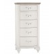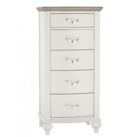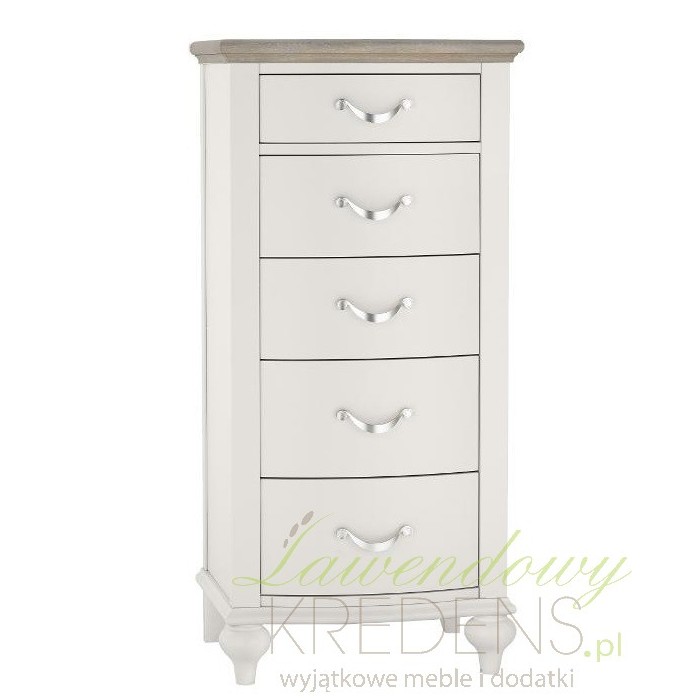 Wysoka komoda w stylu prowansalskim posiadająca pięć praktyczny szuflad z systemem cichego domyku. Posiadają one srebne, poręczne uchwyty. Ozdobne nóżki idealnie komponują się w jedną całość. Połączenie bukowej podstawy z dębowym blatem zapewni funcjonalność na lata.