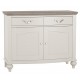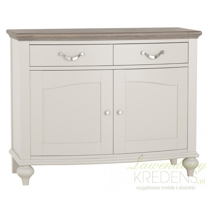 Komoda w stylu prowansalskim z dwiema szufladkami i szafeczką w kolorze jasnoszarym.