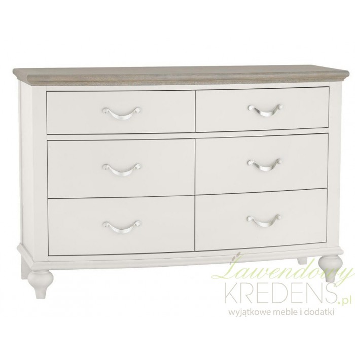 Prowansalska komoda w jasnoszarym kolorze producenta Livin Hill. Posiada sześć pojemnych szuflad, ciemny, brązowy, dębowy blat i podstawę z drewna bukowego. Same szufladki posiadają eleganckie, srebrne uchwyty oraz prowadnice z systemem cichego domykania, Całość dopełniają wyjątkowe przednie, pękate nóżki.