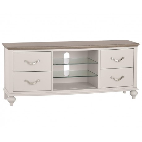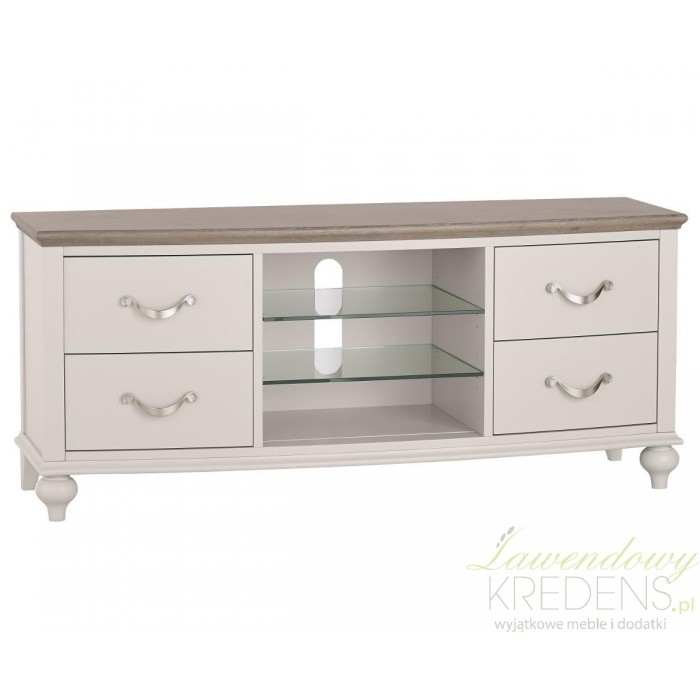Komoda RTV w stylu prowansalskim z czterema szufladkami oraz dwiema szklanymi półkami. Same szufladki posiadają niezawodny stystem cichego domykania. Blat komody jest w kolorze brązu wykonany z drewna dębowego, zaś cała podstawa z drewna bukowego. Komoda idealnie nadaje się do salonu jak i do sypialni.