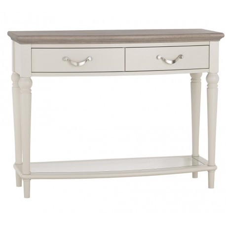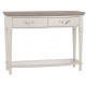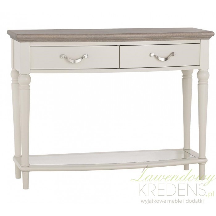 Prowansalska komoda z półką od producenta Livin Hill w jasnoszarym kolorze z odcinającym się kolorystycznie, brązowym blatem. Podstawa konsoli wykonana z drewna bukowego zaś blat dębowego. Dwie pojemne szufladki posiadają srebne bardzo poręczne uchwyty. Półka jest przeszklona, co daje niesamowiego uroku. Dodatkowo delikatnie pękate nóżki poniżej blatu i wszystko składa się w całość. Konsola ta jest idealna do salonu, przedpokoju sypiani czy innych pomieszczeń!