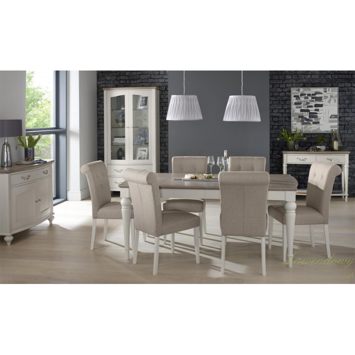 Prowansalski regał producenta Livin Hill, idealny do salonu, jadalni a także innych pomieszczeń. Jego przeszkoina górna część nadaj we dużo uroku. Posiada on trzy szklane półki oraz dwie podłużne szufladki. Szufladki mają uchwyty w kolorze srebrnym a taże system cichego domyku. Całość mebla wygląda delikatnie, także za sprawą niziutkich, pękatych nóżek jednakże dzięki fakturze drewna jest stabilny. Całość mebla wykonana z drewna bukowego, zaś sam blat z drewna dębowego.