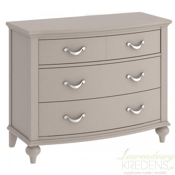 Prowansalska komoda wykonana jest z wysokiej klasy drewna bukowego oraz płyty MDF. Dodatkową atrakcją są przepiękne srebrne uchwyty. Komoda posiada dwie małe i dwie duże szuflady z systemem cichego domyku szuflad. Meble w stylu prowansalskim to bogactwo wzorów i kształtów oraz różnorodność uchwytów.