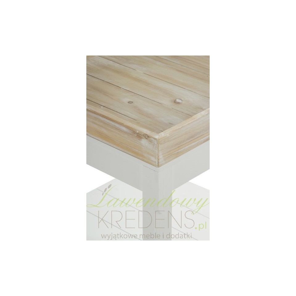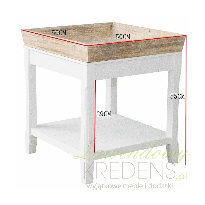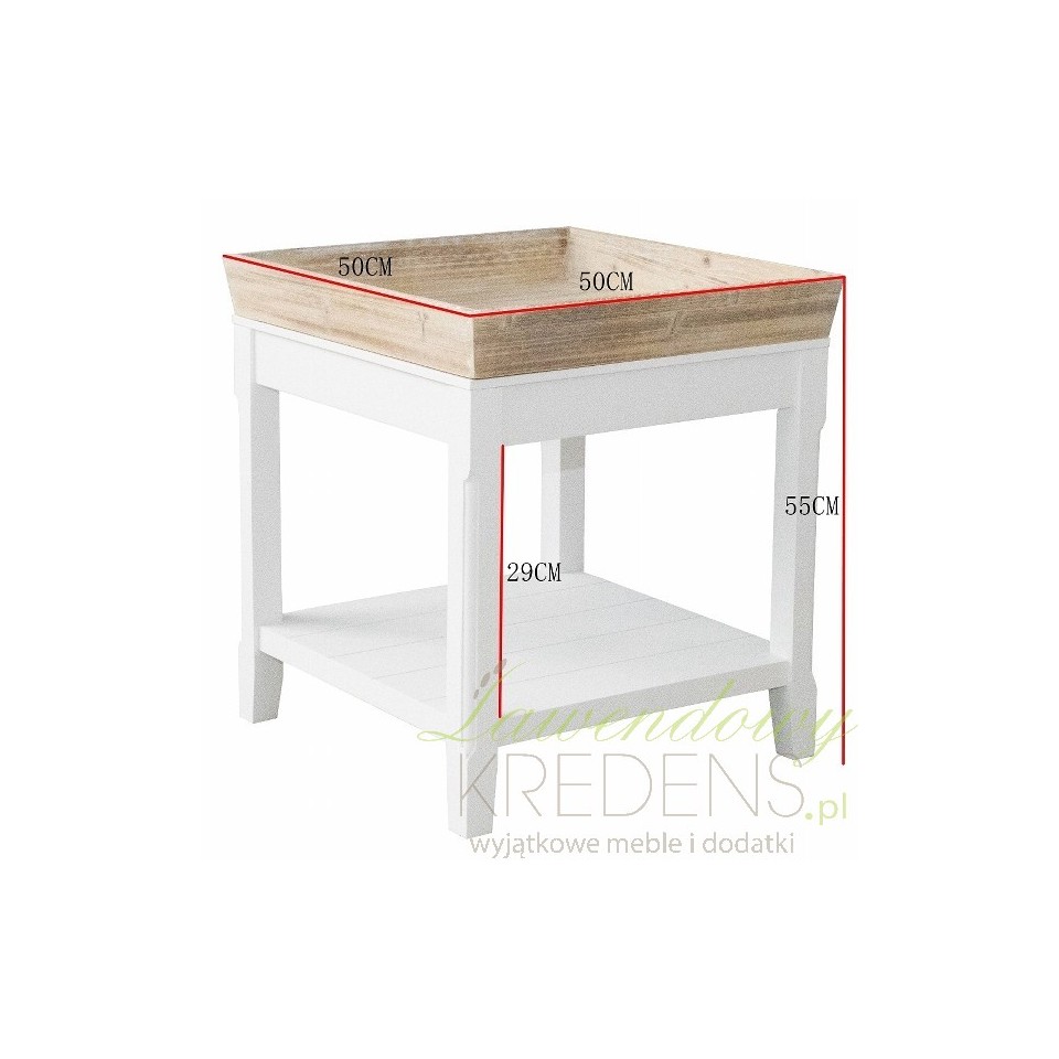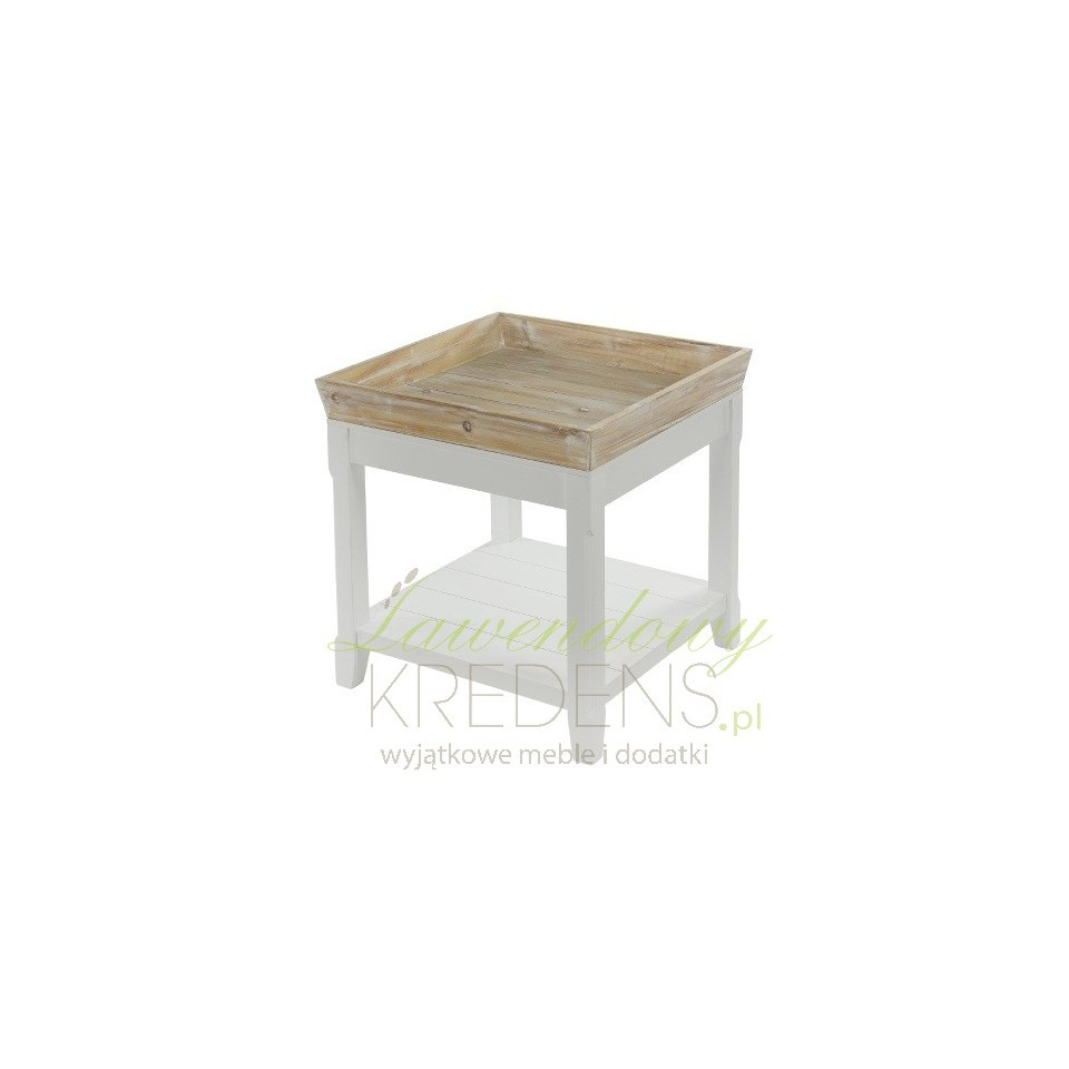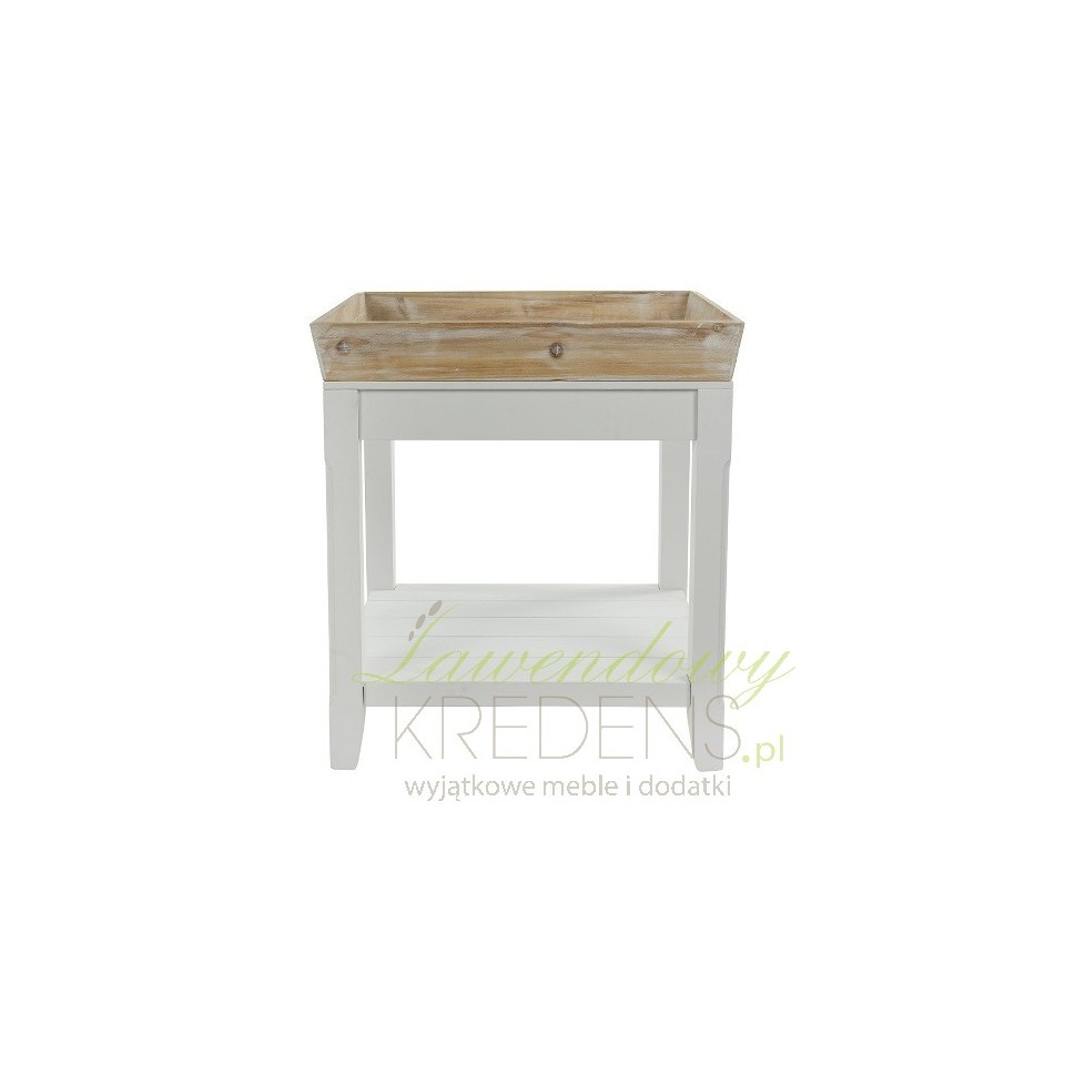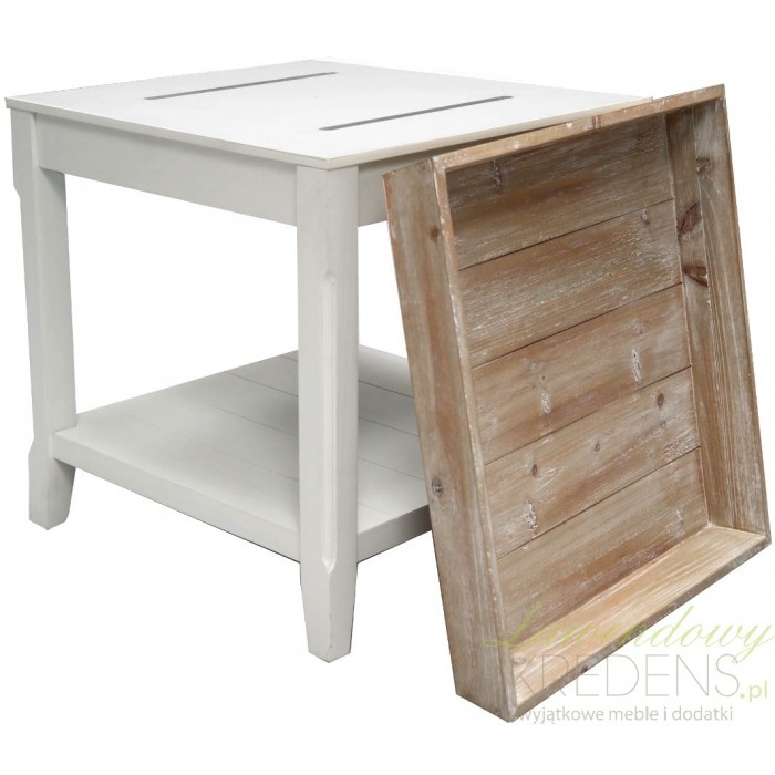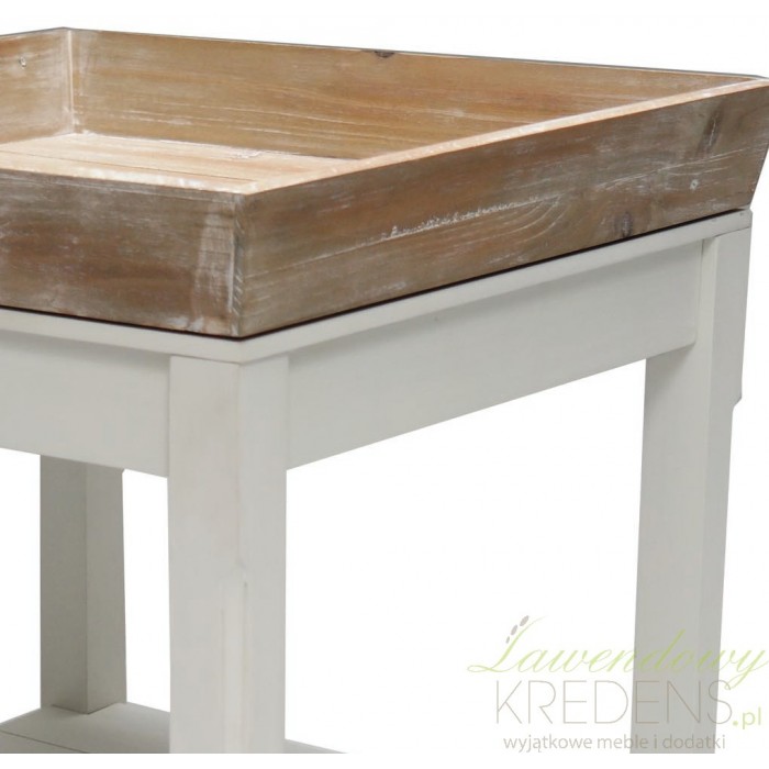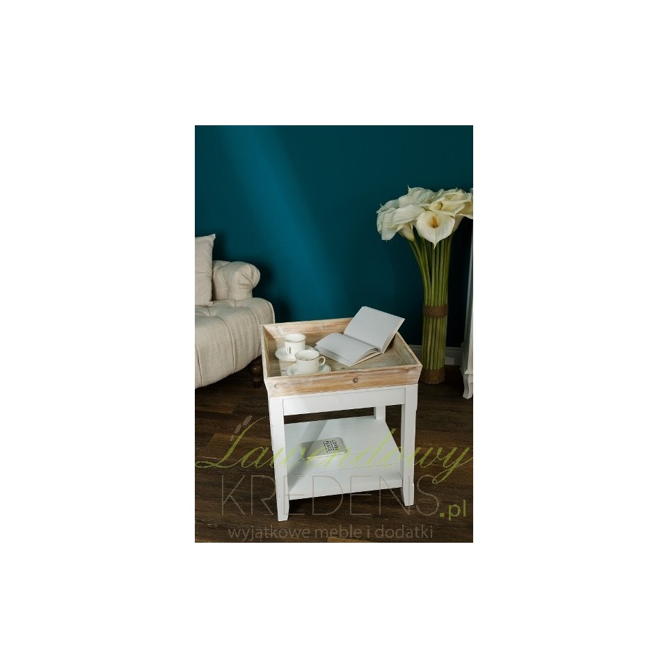Stolik prowansalski wykonany jest z białego matowego i bielonego drewna. Stolik kawowy pochodzenia niemieckiego posiada brązową, zdejmowaną tacę i jedna półeczkę na dole. Zdejmowana taca stanowi bardzo praktyczne rozwiązanie, które również jest świetną dekoracją stolika. Meble w stylu prowansalskim to doskonały wybór!