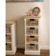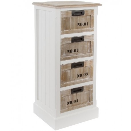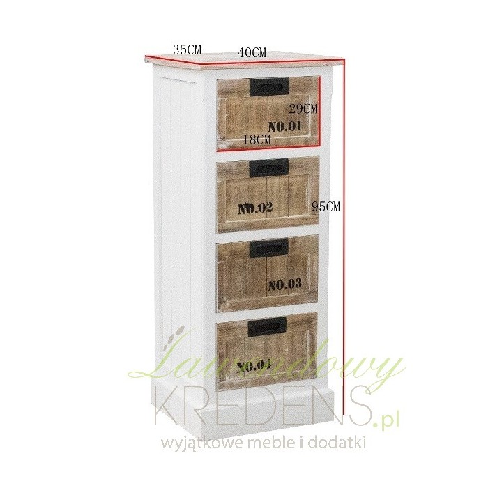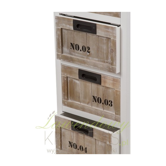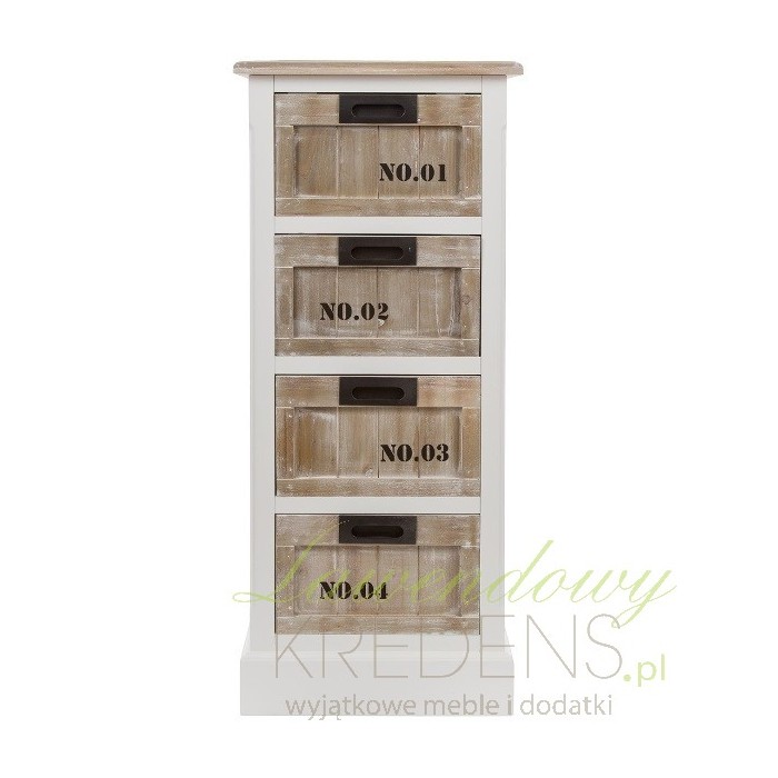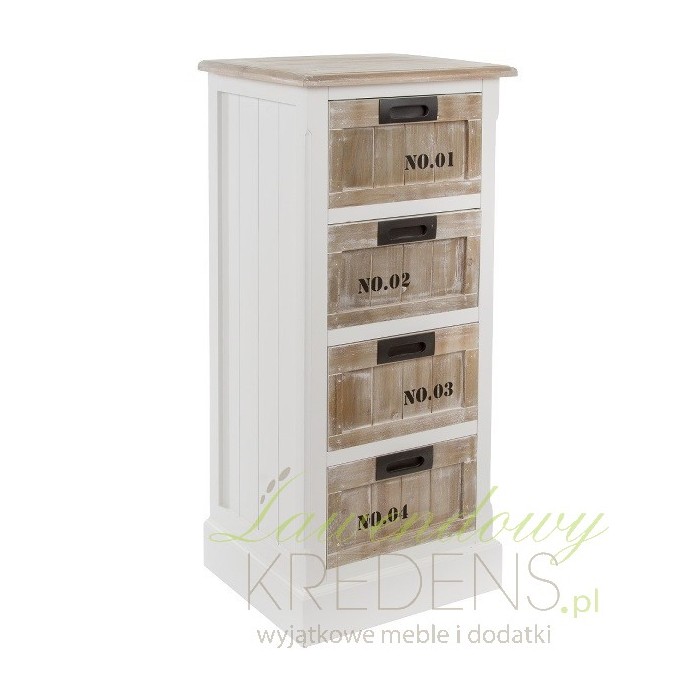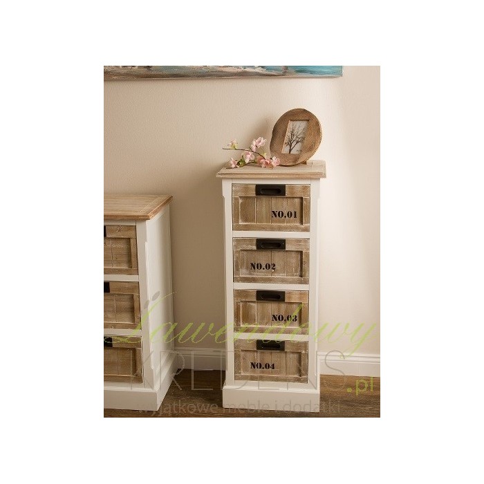 Meble w stylu prowansalskim to niezwykła propozycja dla osób lubiących odmianę i francuski klimat. Komoda prowansalska pochodzenia niemieckiego wykonana jest z wysokiej jakości drewna w kolorze białym i kolorze bielonego drewna. Wąska komoda posiada cztery szuflady i ozdobne numery na nich. Świetnie będzie wyglądać w pokoju, jako dodatek do łóżka i szafy.