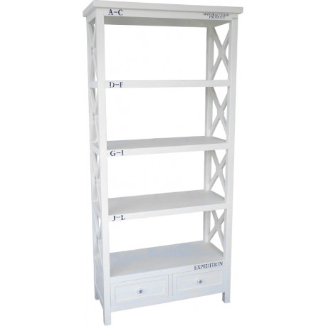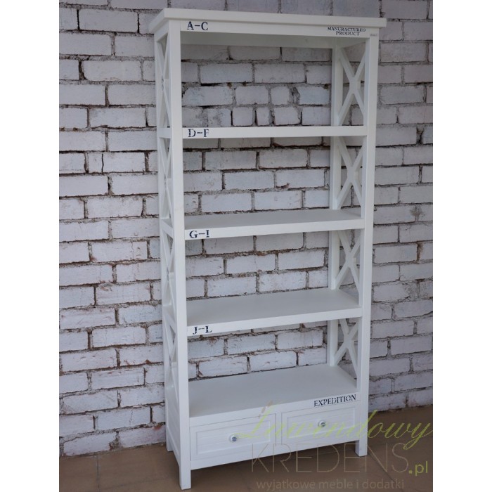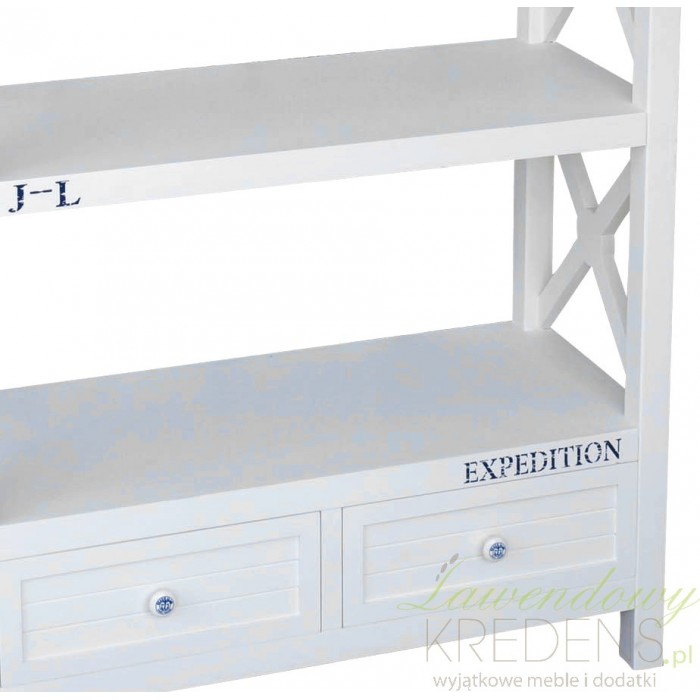 Regał w stylu marynistycznym został wykonany z drewna paulowania i pomalowany na biało. Mebel został wyposażony w cztery pojemne półki oraz dwie szuflady. Zdobienie regału stanowią napisy w kolorze granatowym. Elementami wyróżniającymi mebel spośród innych są ciekawie ukształtowanie boki, którym nadano kształt interesująco wyglądającego i ładnie prezentującego się krzyżowania. Białe meble marynistyczne - piękno i wyjątkowość!
