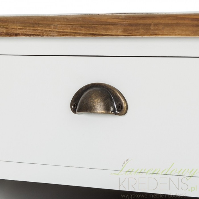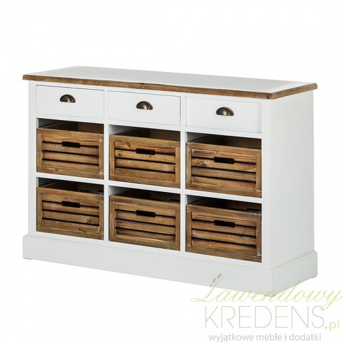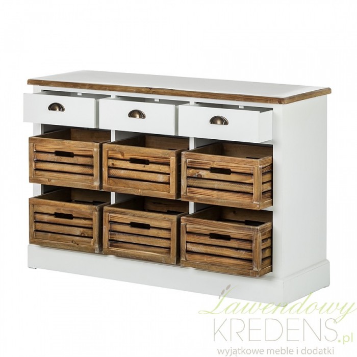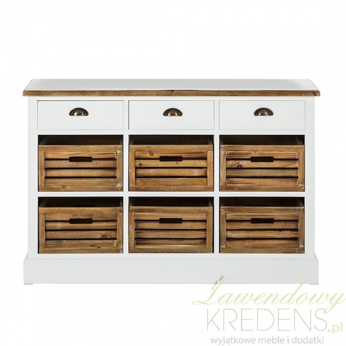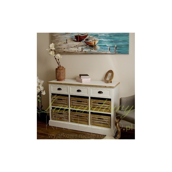 Szeroka i niebywale pojemna komoda prowansalska łącząca w sobie dwa uzupełniające się kolory: biel i brąz. To ich charakterystyczne połączenie wraz z oryginalnymi szuflado-półkami w formie skrzynek przyciągają uwagę wszystkich i sprawiają, że wnętrze staje się wyjątkowe i niezapomniane!