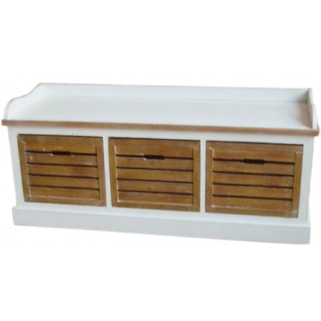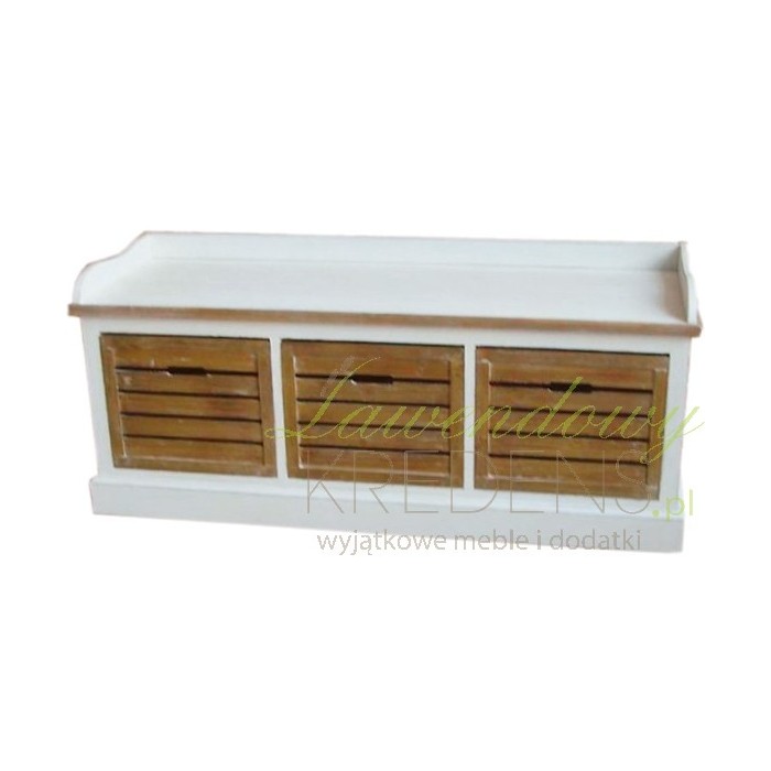 Oryginalnie wyglądająca niska komoda w stylu prowansalskim, która została stworzona z myślą o siedzeniu na niej! Biała komoda prowansalska z kontrastującymi kolorystycznie, trzema szufladami, które formą przypominają drewniane skrzynki. Usiądź na niej i np. wygodnie nakładaj buty przed wyjściem z domu!