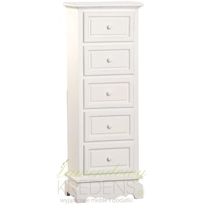 Biała komoda idealnie sprawdzi się na małych powierzchniach. Wąska i wysoka, zajmie niewiele miejsca w mieszkaniu. Komoda prowansalska z kolekcji Riviera posiada pięć szufladek na kosmetyki lub bieliznę. Oparta jest na solidnych nogach, które stanowią również fenomenaln dekorację komody. Meble prowansalskie to cudowny styl i precyzyjne wykonanie.