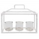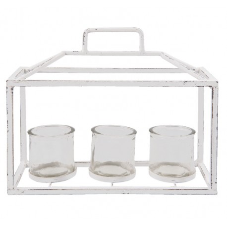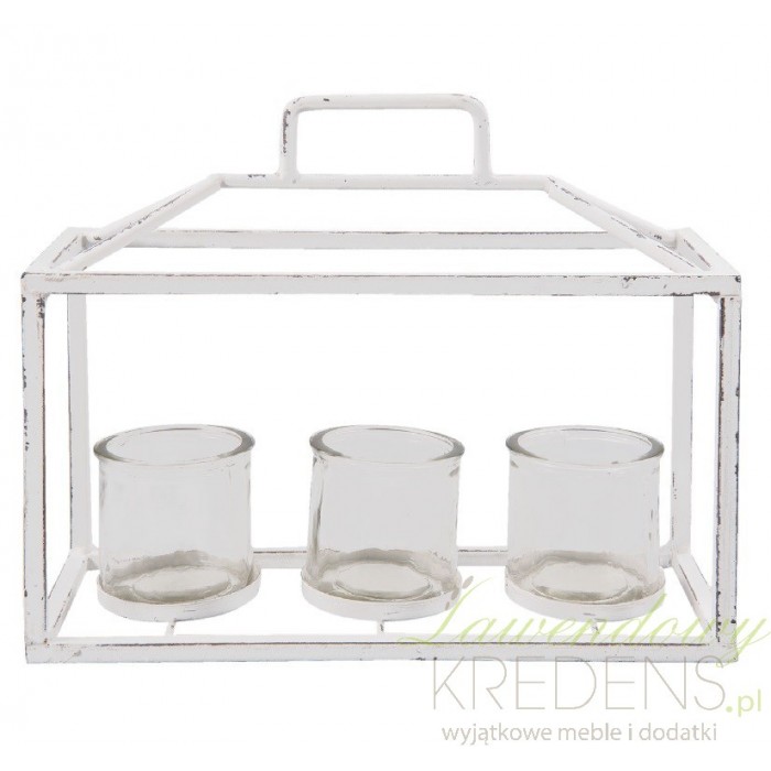 Lampion Shabby Chic od marki Clayre&Eef ma kolor antycznej bieli i przecierki widoczne na każdej krawędzi. Otwarte ściany odsłaniają trzy szklane pojemniki na świeczki, ustawione w jednej linii. Metalowy lampion w białym kolorze to sposób na ocieplenie wizerunku salonu lub pokoju dziennego. Wprowadź do domu nutę nostalgii i romantyzmu, wykorzystując lampiony Shabby Chic!