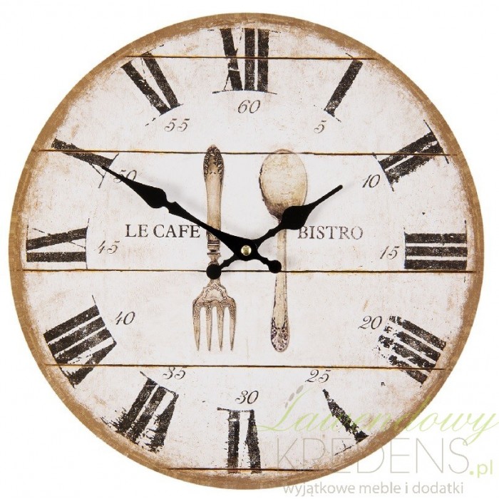 Okrągły zegar ze sztućcami jest zasilany jedną baterią. Tarcza zegara ma jasny kolor i ciemne, postarzające cały zegar obramowanie. Pośrodku zegara naniesiono grafikę łyżki i widelca oraz napis le Cafe Bistro. Zegary ścienne staną się przyjacielem kuchennego wnętrza ale także restauracji w stylu francuskim.