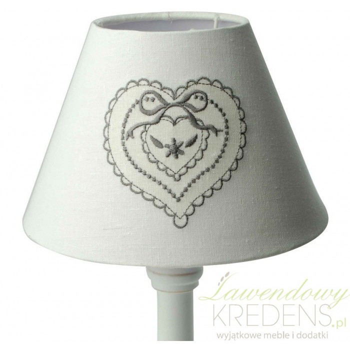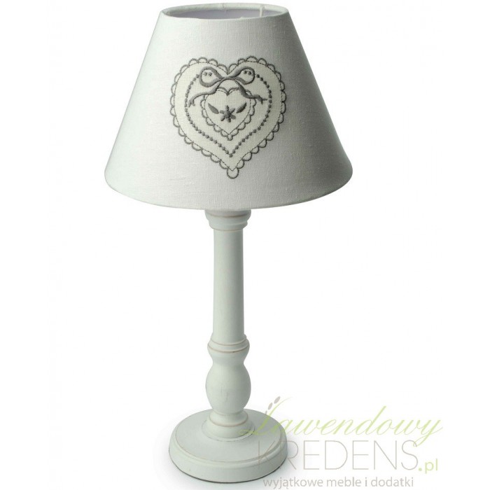 Zjawiskowa, biała lampka prowansalska na drewnianej nóżce z bawełnianym abażurem. Abażur ozdobiony został naszytymi ciemniejszą nicią uroczymi sercami. Lampki w stylu prowansalskim wieczorami pomagają w budowaniu przytulnego nastroju, a w dzień mogą być elementem dekoracji. Biała lampka prowansalska z sercami to świetny wybór!