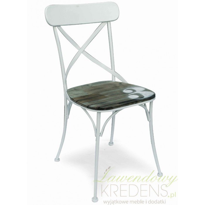 Metalowe krzesło w białym kolorze z drewnianym siedziskiem ozdobionym namalowaną cyfrą "3".