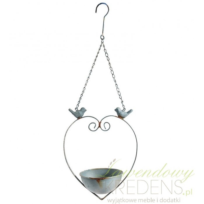 Zawieszka Belldeco składa się z miseczki znajdującej się w serduszku, do której są przyczepione dwa ptaszki na łańcuszku i haczyku. Dekoracja wisząca firmy Belldeco wykonana jest w całości z postarzanego, niczym przeżartego rdzą metalu. Nadaje jej to ponadczasowy i niezwykły charakter.