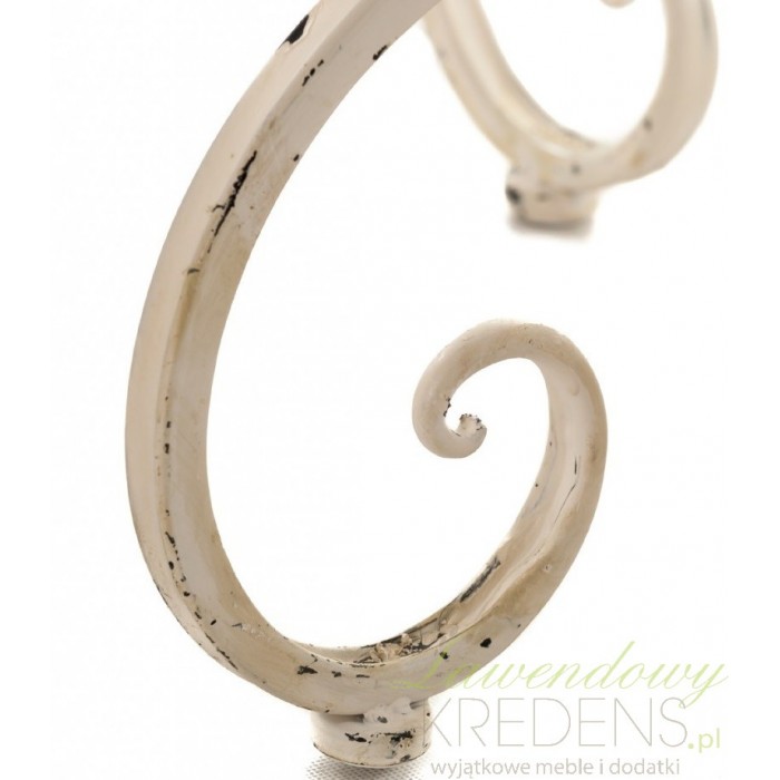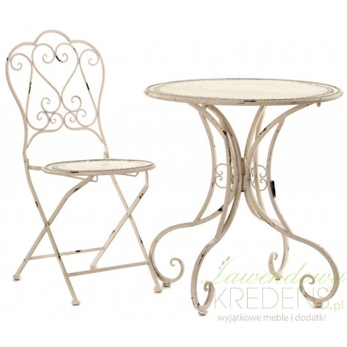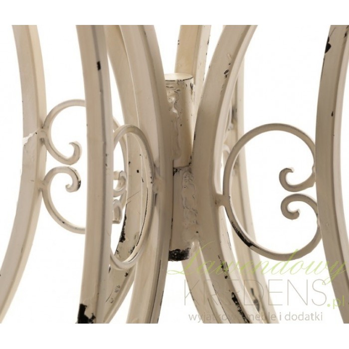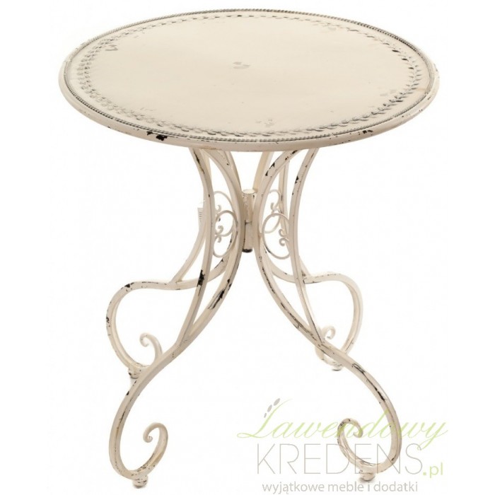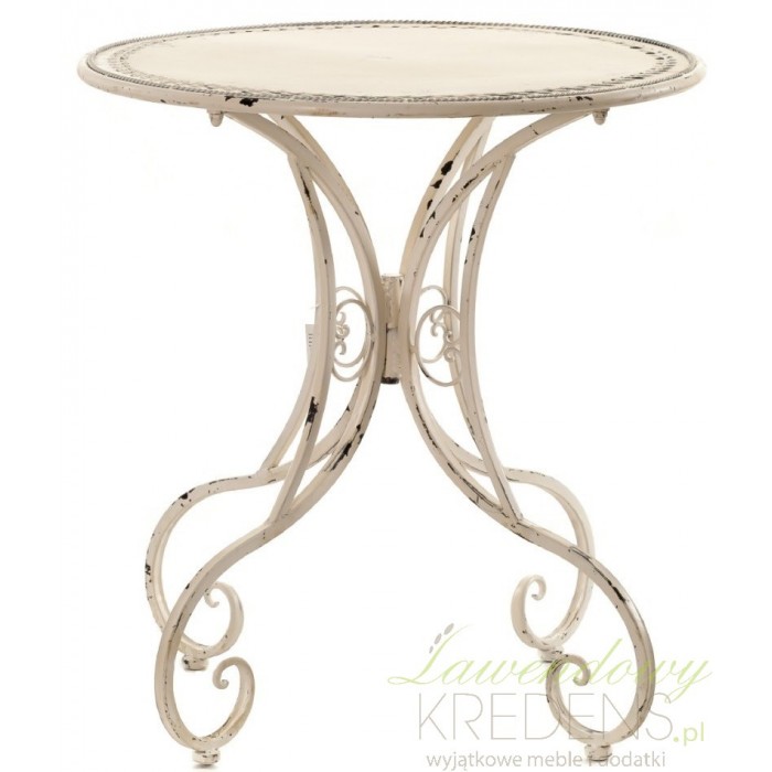 Kremowy i metalowy stolik prowansalski firmy Aluro o finezyjnych i falistych nogach, bardzo dekoracyjnych nogach.