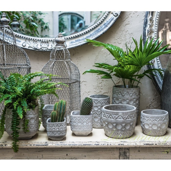Osłonki Belldeco Grigio wykonane zostały z cementu a ich kolor to odcienie szarości. Charakterystyczne na tych osłonek są wklęsłe i wypukłe wzorki biegnące na około osłonek. Ze względu na praktyczny i uniwersalny, szary kolor do osłonek będą pasowały zarówno rośliny zielone jak i kwitnące kwiaty w każdym kolorze. Do osłonki polecamy pozostałe osłonki na doniczki Belldeco z tej kolekcji, dzięki czemu łatwo będzie Państwu stworzyć śliczną aranżację. Aby się zainspirować zachęcamy do obejrzenia trzeciego zdjęcia produktu.
