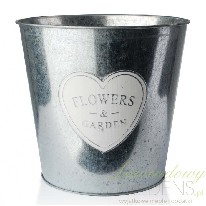 Metalowa osłonka w formie wiaderka z białym serduszkiem, w środku którego widnieje napis FLOWERS & GARDEN. Jest niezwykle ciekawym dodatkiem do ogrodu, kuchni, jadalni, tarasu czy na balkon. W osłonce możesz śmiało umieścić doniczkę z kwiatem, z pewnością będzie wyglądać nadzwyczajnie! Osłonkę na doniczke możesz wykorzystać również do kompozycji z suszonych kwiatów bądź do przechowywania suszonych ziół lub przypraw.
