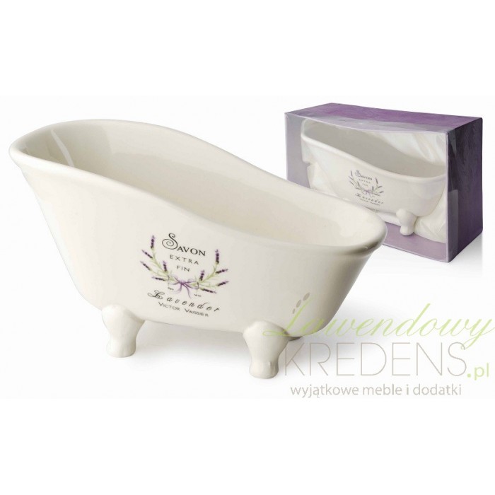 Dodatki prowansalskie do łazienki to doskonały pomysł by wnętrze stało się praktyczne i stylowe. Pojemnik do łazienki w kształcie eleganckiej wanny ma kremowy kolor i fioletowe kwiaty lawendy z zielonymi gałązkami naniesione na jeden z boków oraz francuskie napisy. Wykonany został z ceramiki. Motyw lawendy i praktyczne dodatki do łazienki to zachwycające połączenie.