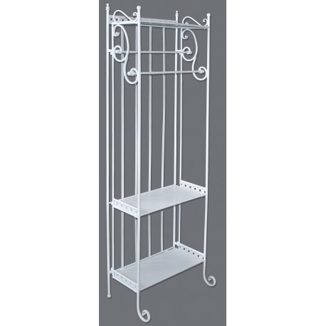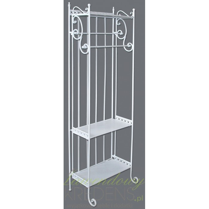 Metalowy stojak na ręczniki inspirowany stylem prowansaslkim. W górnej części regału znajdują się dwa drążki na ręczniki, a oprócz drążków regał posiada trzy metalowe, praktyczne półki. Regał świetnie sprawdzi się w łazience jako regał na ręczniki. Dzięki ażurowemu wykończeniu półek oraz uroczo zawijanym, metalowym drążkom, regał zdecydowanie zyskuje na lekkości.