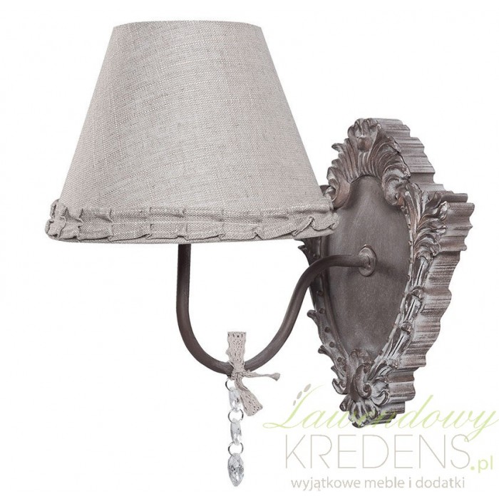 Kinkiet Belldeco z kolekcji lamp i kinkietów Romantic to pięknie zdobiony kinkiet w stylu prowansalskim. Część kinkietu którą montuje się do ściany ma bardzo elegancki kształt, natomiast abażur kinkietu Romantic Belldeco zrobiony jest z szarej bawełny i ozdobiony falbanką z tego samego materiału.