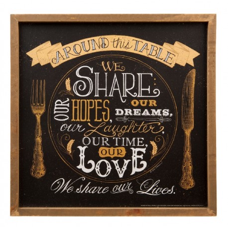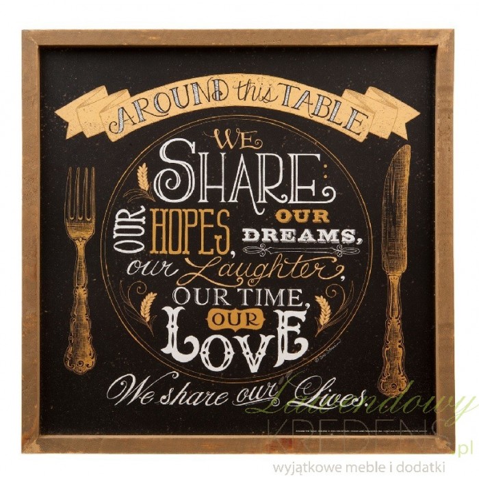 Obrazki do kuchni to coraz częściej spotykane w polskich domach ozdoby kuchennych i jadalnianych ścian. Obrazek w prostej ramce z drewna ma czarne tło, a na nim wyrysowany okrągły talerz oraz sztućce. Na talerzu, w różnej konfiguracji rozmieszczono kolorowe napisy angielskie, mówiące o wzajemnych zasadach pomiedzy domownikami. Obrazek do kuchni od Clayre&Eef to możesz podarować bliskiej osobie.