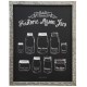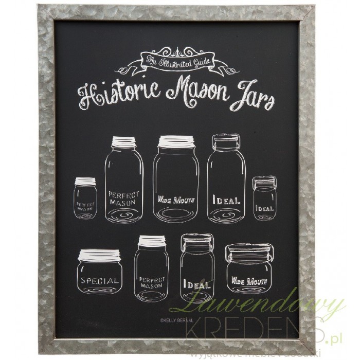 Obraz do kuchni to czarna tabliczka przedstawiająca słoiki, oprawiona w szarą ramkę zrobioną z metalu.