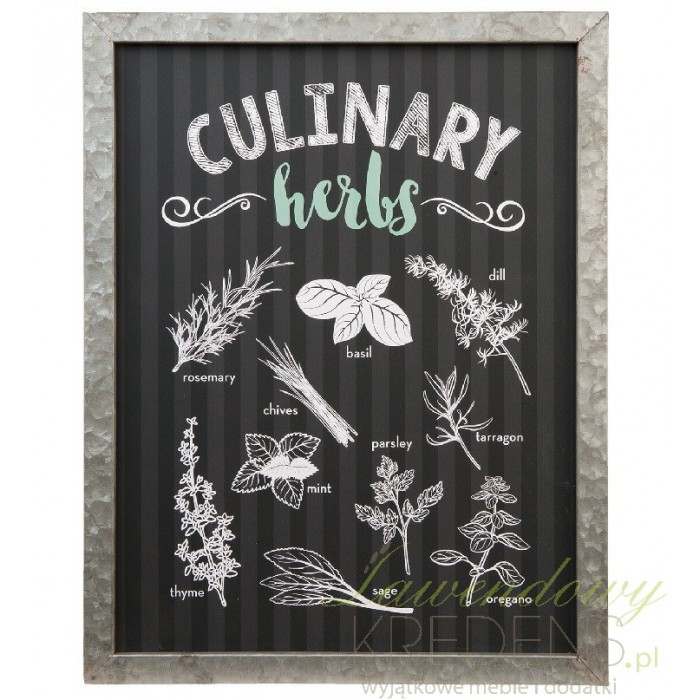 Obraz do kuchni z ziołami wygląda jak wymalowany białą kredą i jest oprawiony w metalową, szarą ramkę. Znajduje się na nim kilka rodzajów ziół, które będą ciekawą wskazówką przy codziennym gotowaniu. To także świetna propozycja na obraz do restauracji włoskiej. Obrazy do kuchni z ciekawymi grafikami możesz podarować w prezencie swojej żonie lub babci.