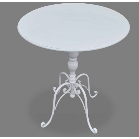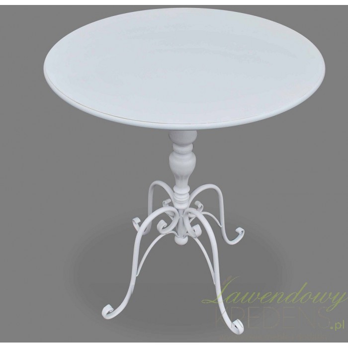 Metalowy stolik prowansalski z okrągłym blatem w białym kolorze. Charakterystyczne, uroczo wygiete nóżki dodają mu lekkości i elegancji. Stolik metalowy to niepozorny mebel, który jest niezastąpiony w wielu sytuacjach gdy np. chcesz napić się popołudniowej kawy lub ustawić na nim ulubioną dekorację. Meble metalowe to genialny wybór jeśli marzysz o aranżacjach balkonu, tarasu lub ogrodu w nieprzeciętnym stylu.