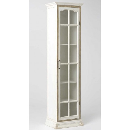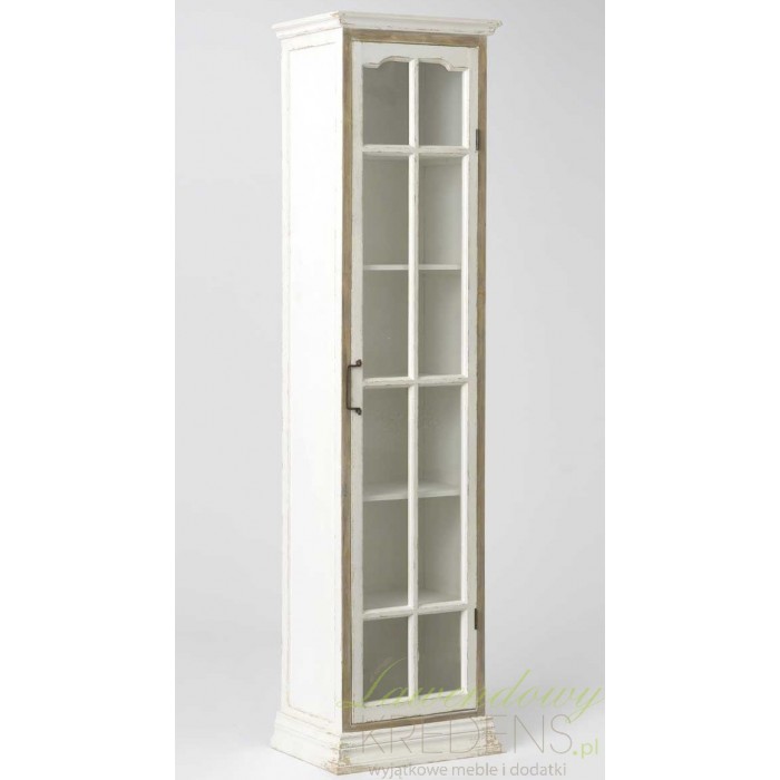 Piękna, wysoka na 180cm witryna jest wykonana z drewna jodłowego oraz płyty mdf. Jej prowansalski styl oddają ciekawie wykonane postarzenia i delikatny, kremowy kolor z brązową wstawką wokół przeszklonych drzwi. Drzwi mebla z ozdobnymi szprosami kryją za sobą półeczki gotowe pomieścić Twoje książki, porcelanę i wiele innych rzeczy. Ta wąska witryna prowansalska to oryginalny i praktyczny mebel, który idealnie zaprezentuje się w gabinecie i w salonie.