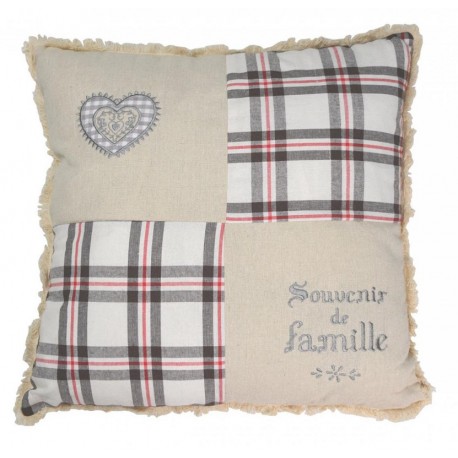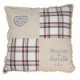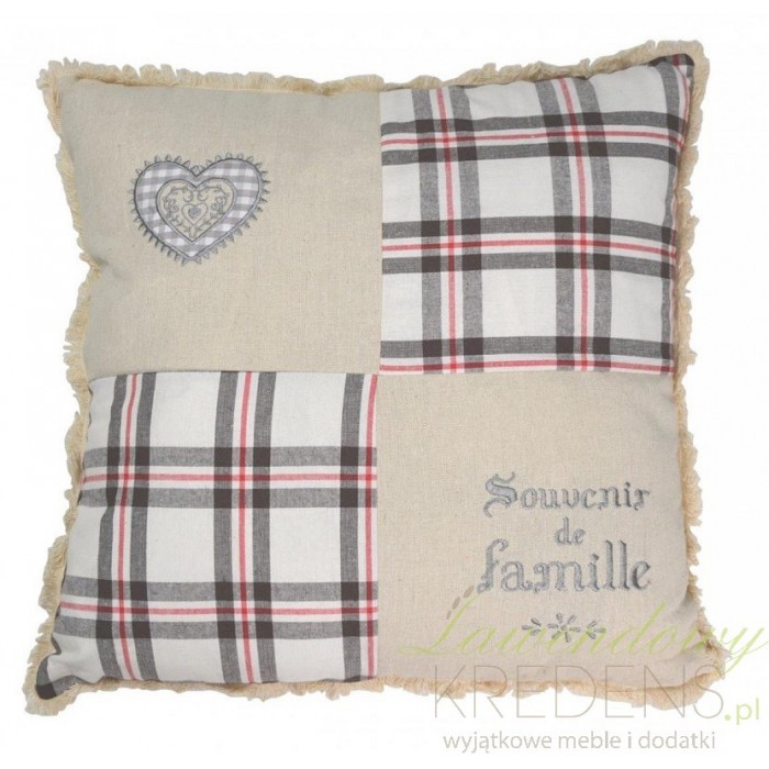 Poduszka prowansalska firmy Livin Hill. Poduszka ma wymiary 44x44cm, zawiera poszewkę zapinaną na suwak, którą z łatwością można ściągnąć. Na poszewce występuje motyw kraty oraz dwie naszywki, jedna z wyszytym sercem a druga z napisem Souvenir de famille. Poduszki w stylu prowansalskim pięknie udekorują Twój dom!